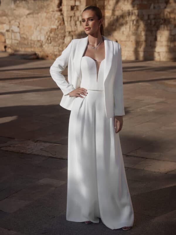 Für Bräute, die sich nicht verkleiden wollen, sondern sie selbst bleiben möchten, ist die Brauthose Modell Ezra von Bianco Evento eine stilvolle Alternative zum klassischen Brautkleid. Ein Look, der im Kopf bleibt und sich genauso gut anfühlt, wie er aussieht.