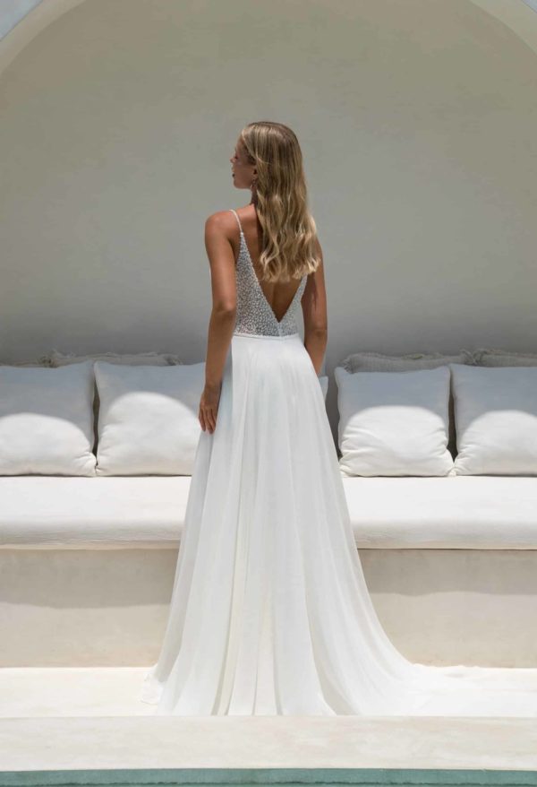 Das Brautkleid -40081- von Amelie ist ein wunderschönes Chiffon- Kleid mit Schleppe und einer Perlencorsage mit Spaghettiträgern.