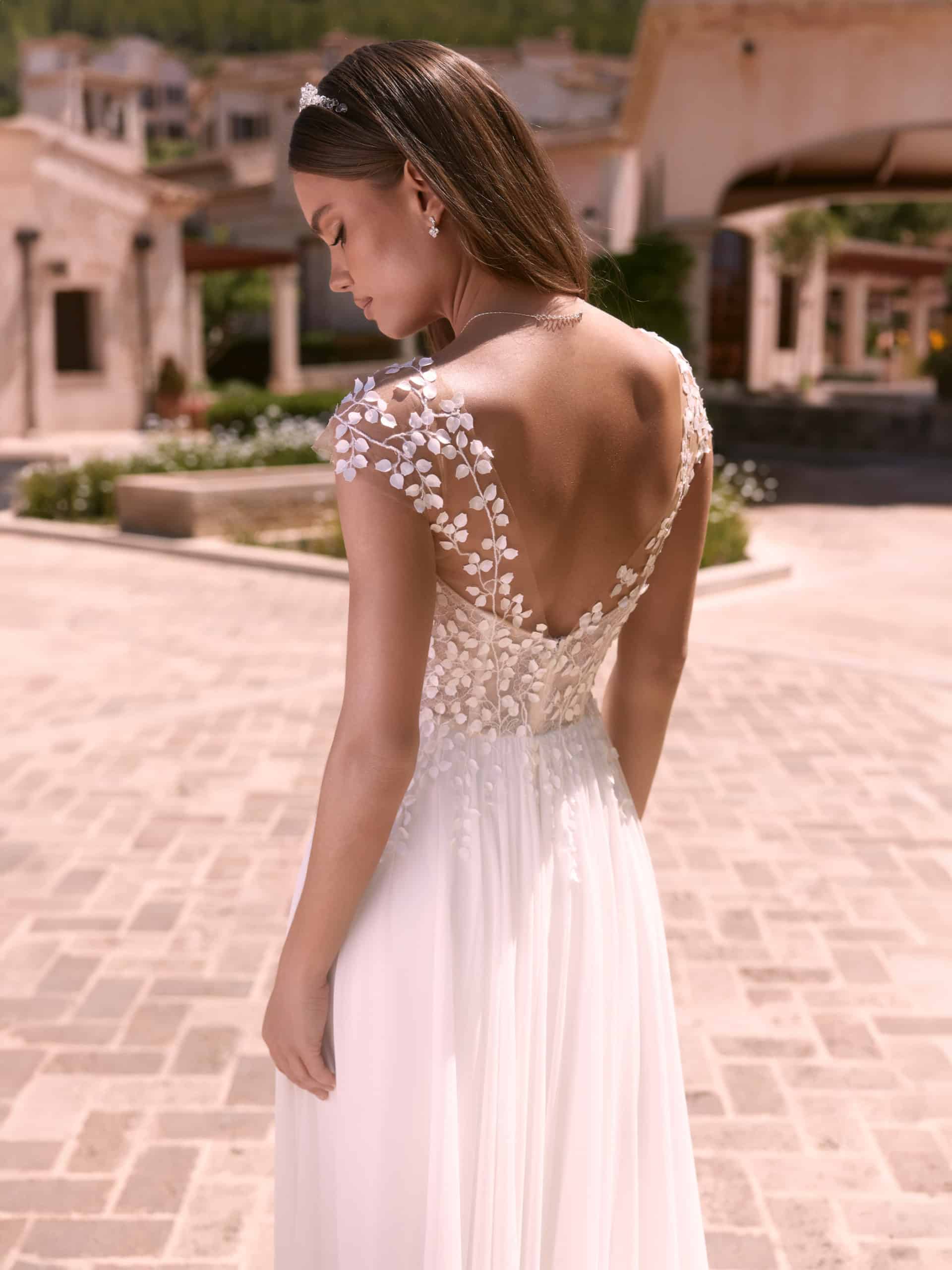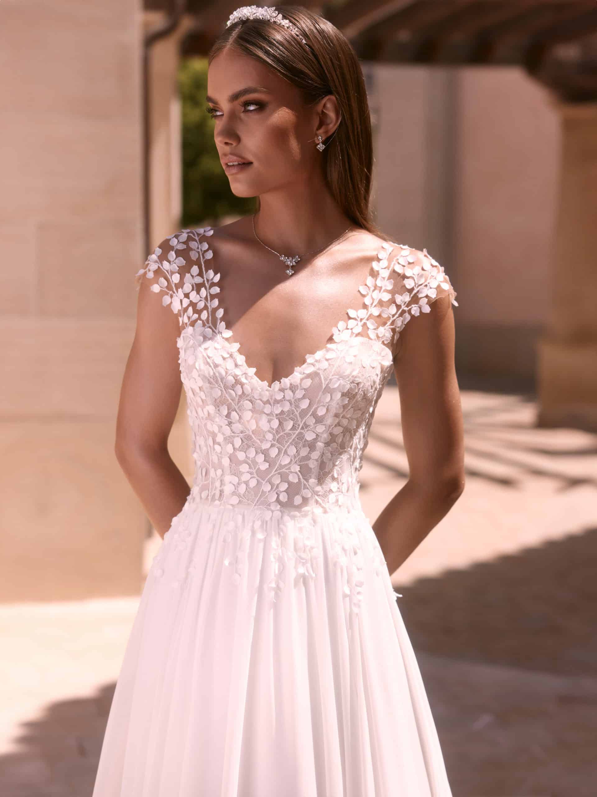 Ein elegantes A-Linien-Brautkleid aus hochwertigem Chiffon und zarter Spitze, das Leichtigkeit und Romantik vereint. Der feminine Herzausschnitt, der schmeichelnde V-Rücken und die kurzen Kapp-Ärmel betonen die Silhouette auf stilvolle Weise. Moderne Blätterspitze und eine lange Schleppe verleihen dem Kleid eine romantische und zugleich zeitgemäße Ausstrahlung.