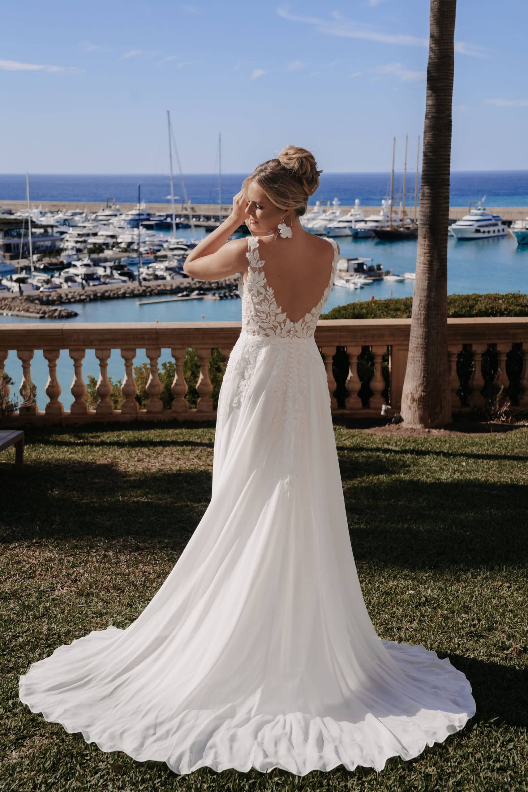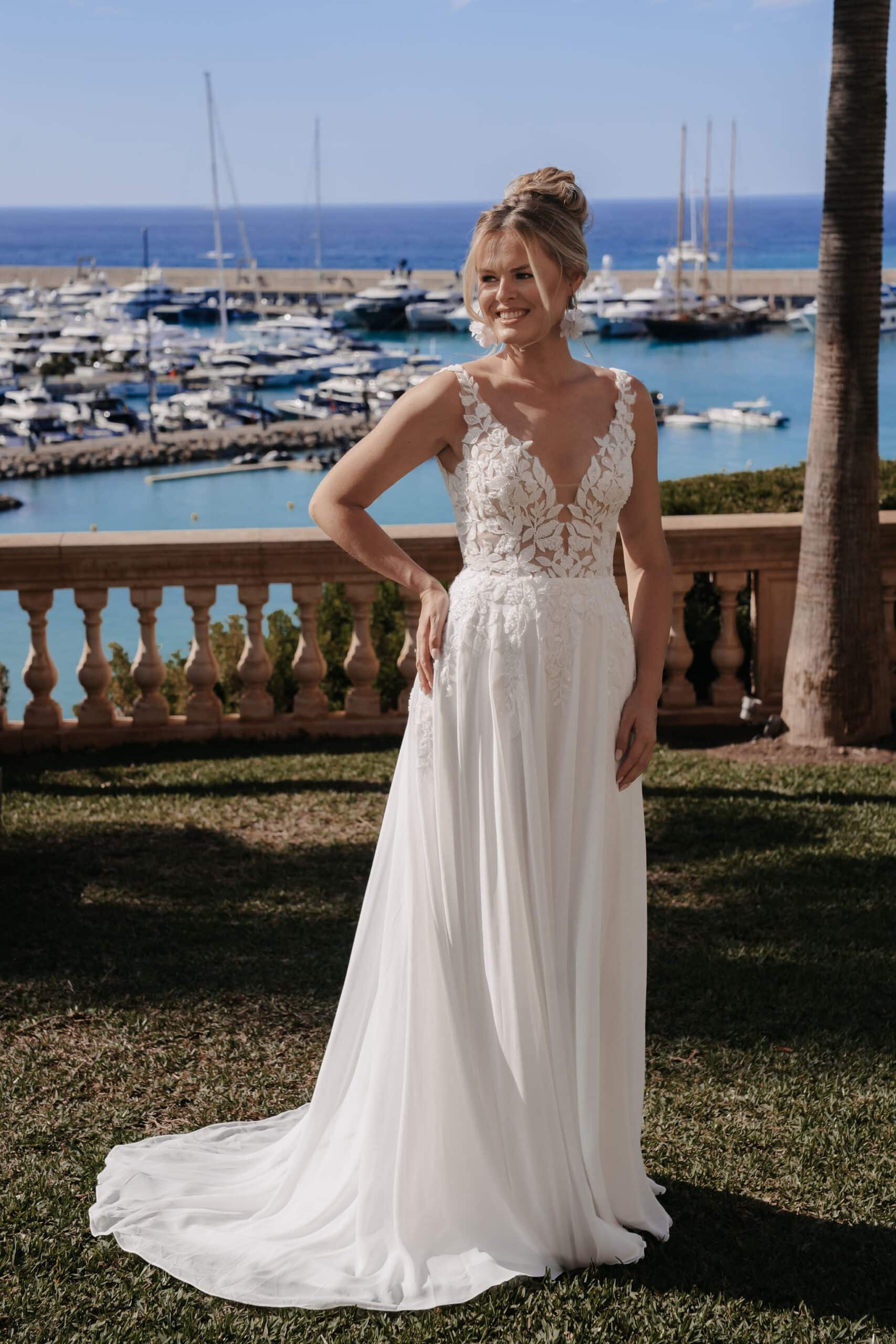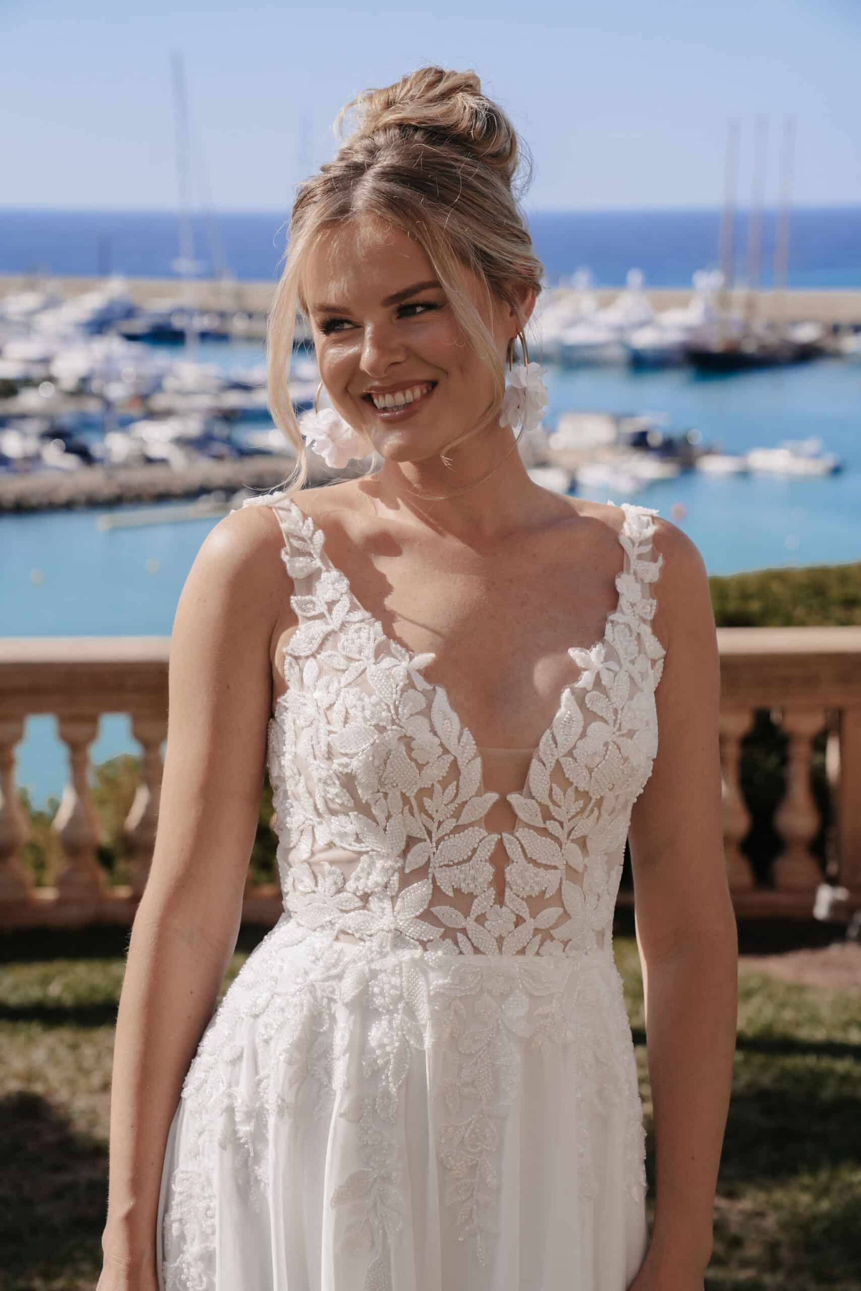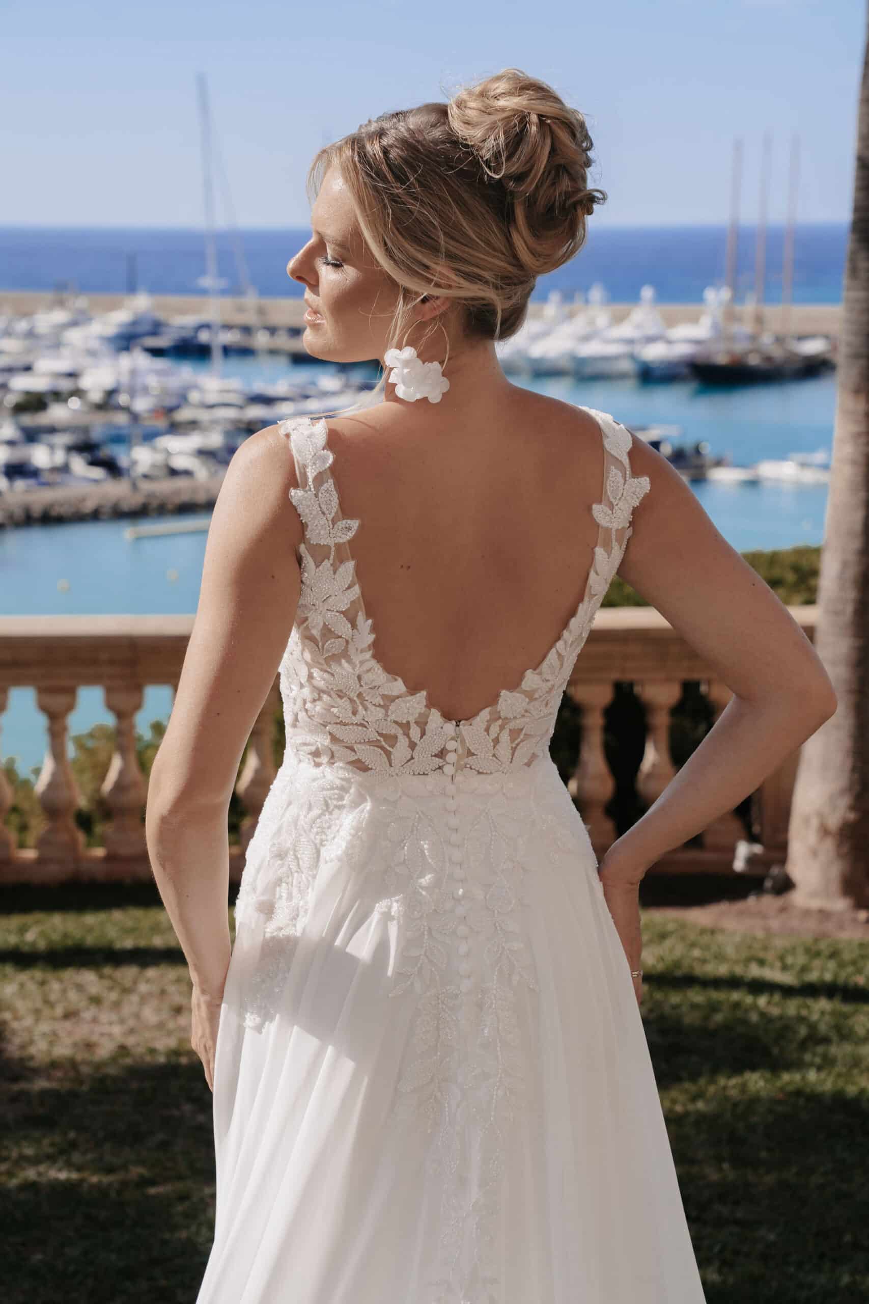 Der wich fallende Rock sorgt für Bewegungsfreiheit und eine natürliche Eleganz, ideal für Hochzeiten im freien oder im Boho Stil. Dieses Kleid ist perfekt für Bräute, die sich stilvoll, unkompliziert und dennoch besonders fühlen möchten.
