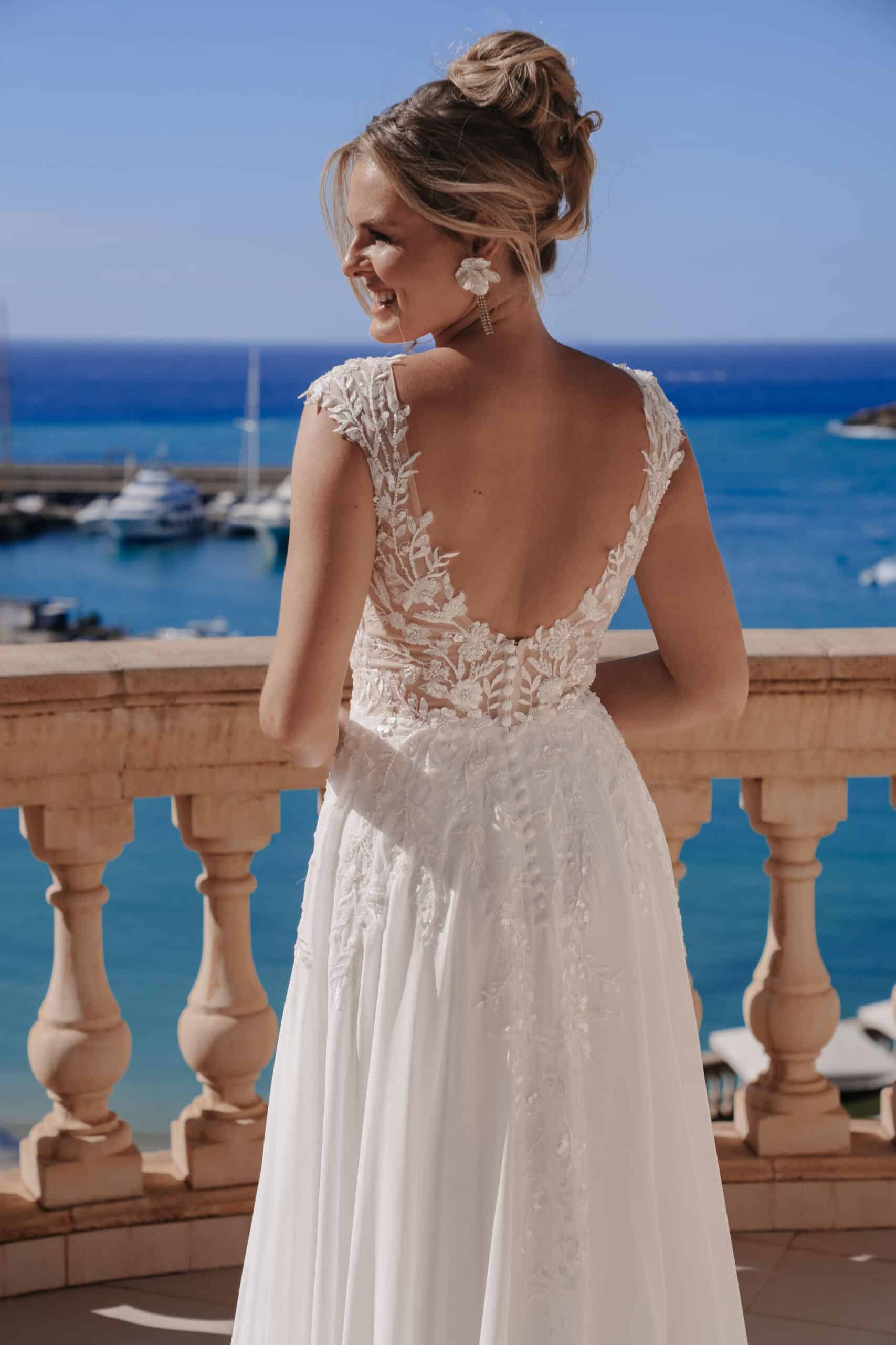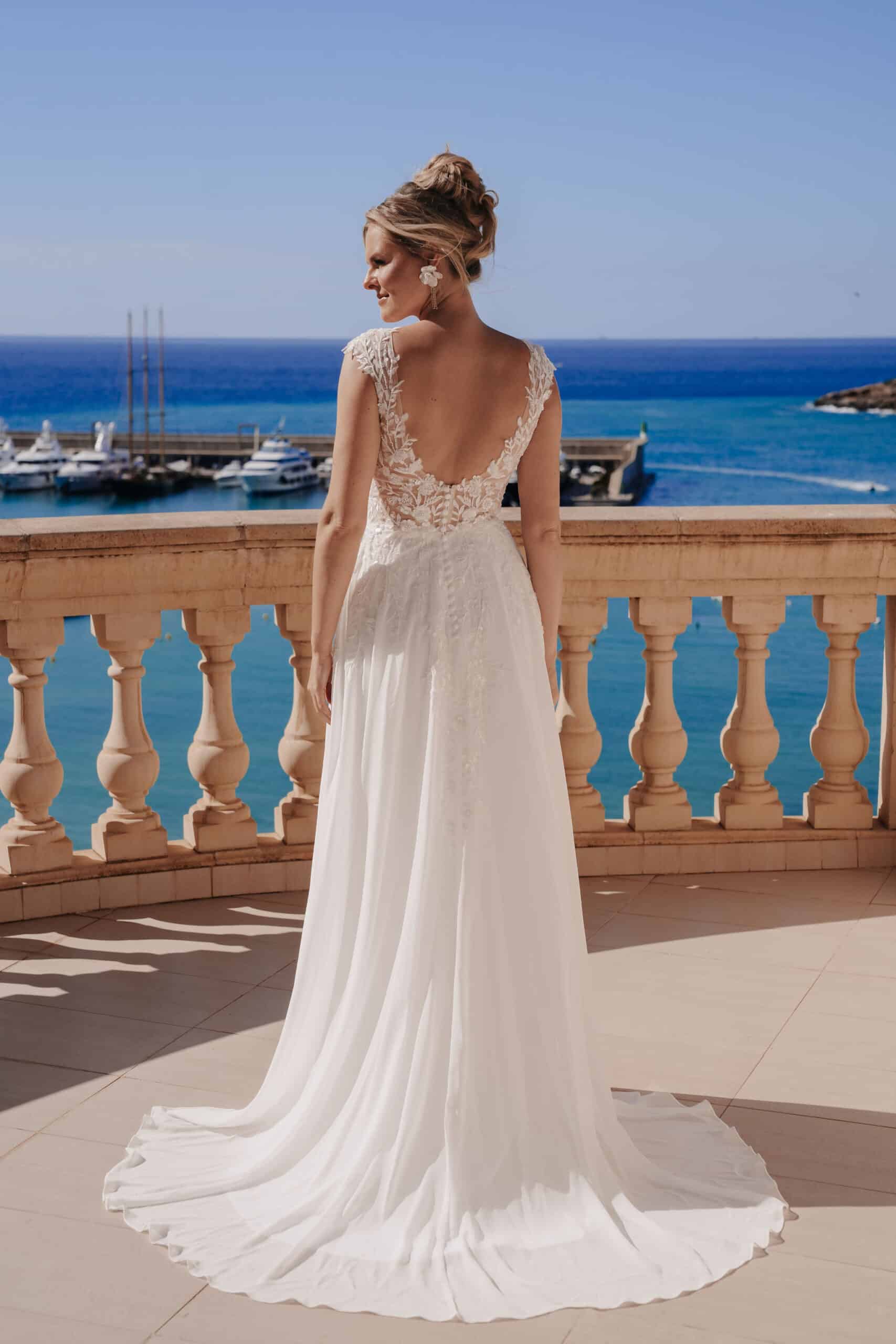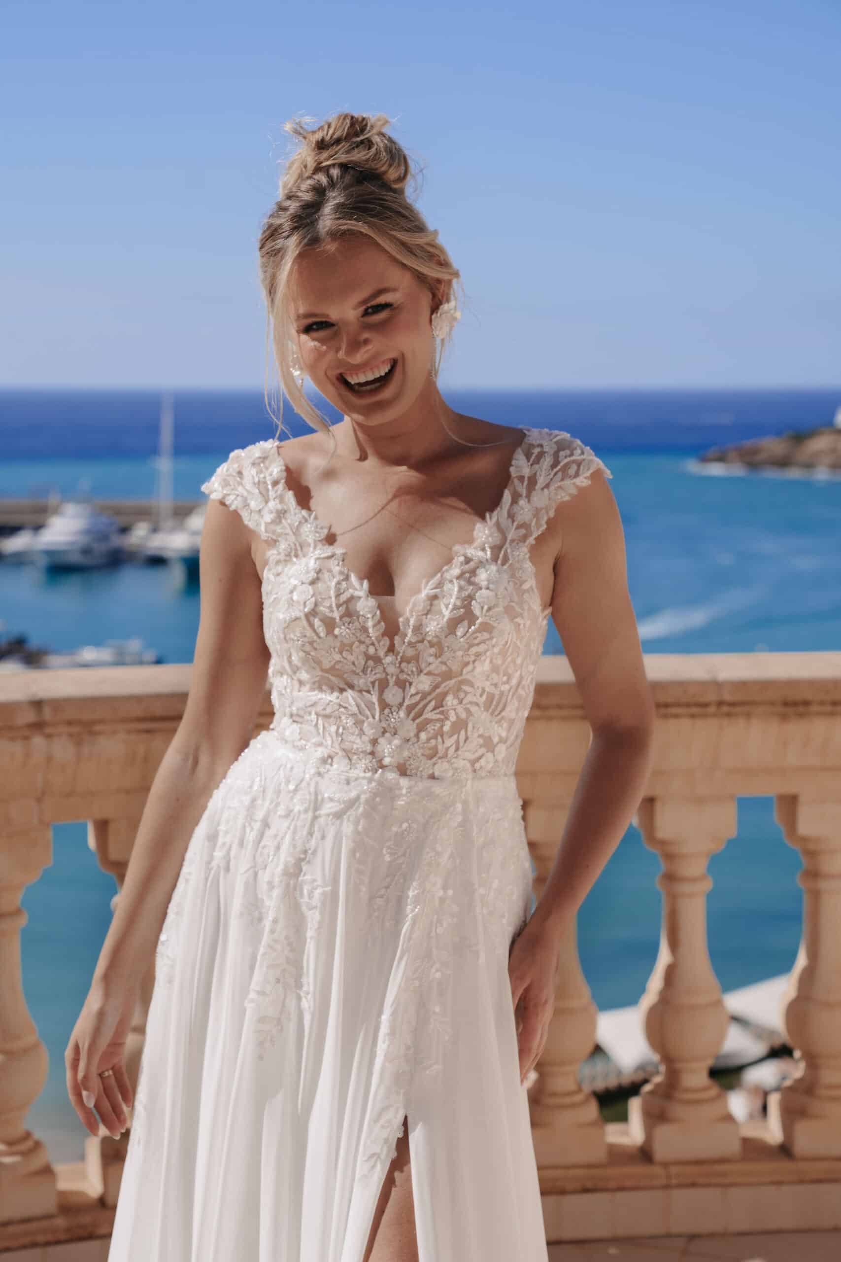 Ein besonderer Blickfang ist der hohe Beinschlitz, der dem Kleid eine moderne und selbstbewusste Note verleiht. Die leichte Stoffqualität macht dieses Brautkleid ideal für Sommerhochzeiten oder Hochzeiten am Meer. Perfekt für Bräute, die sich natürlich, elegant und frei fühlen möchten.