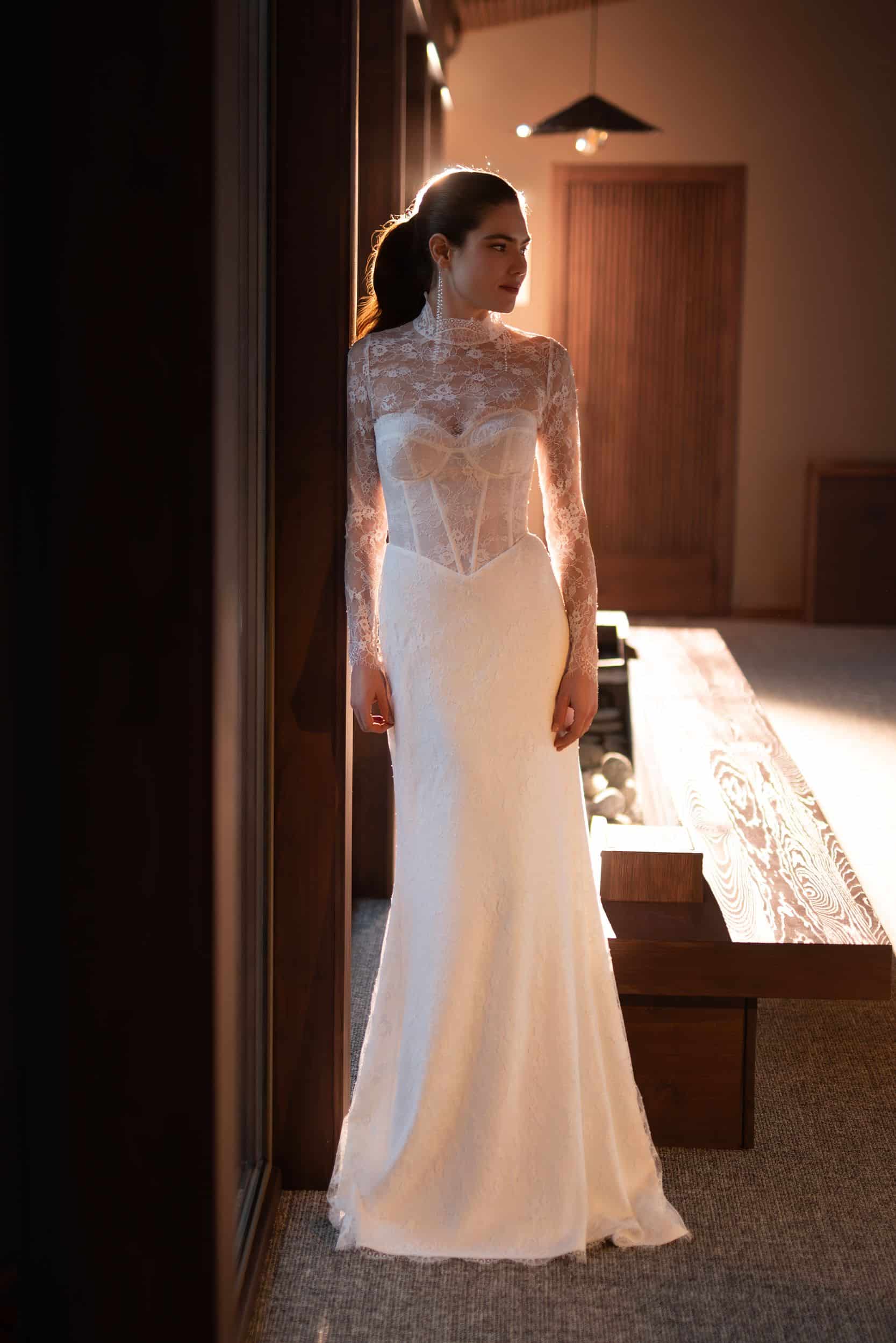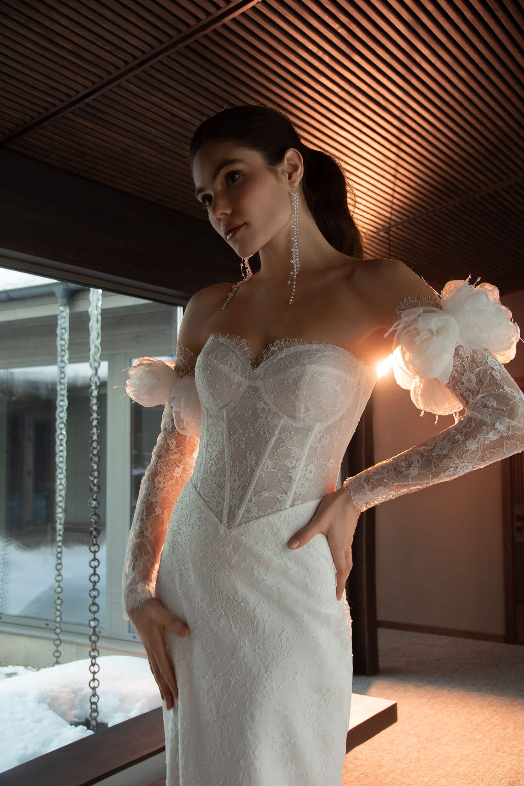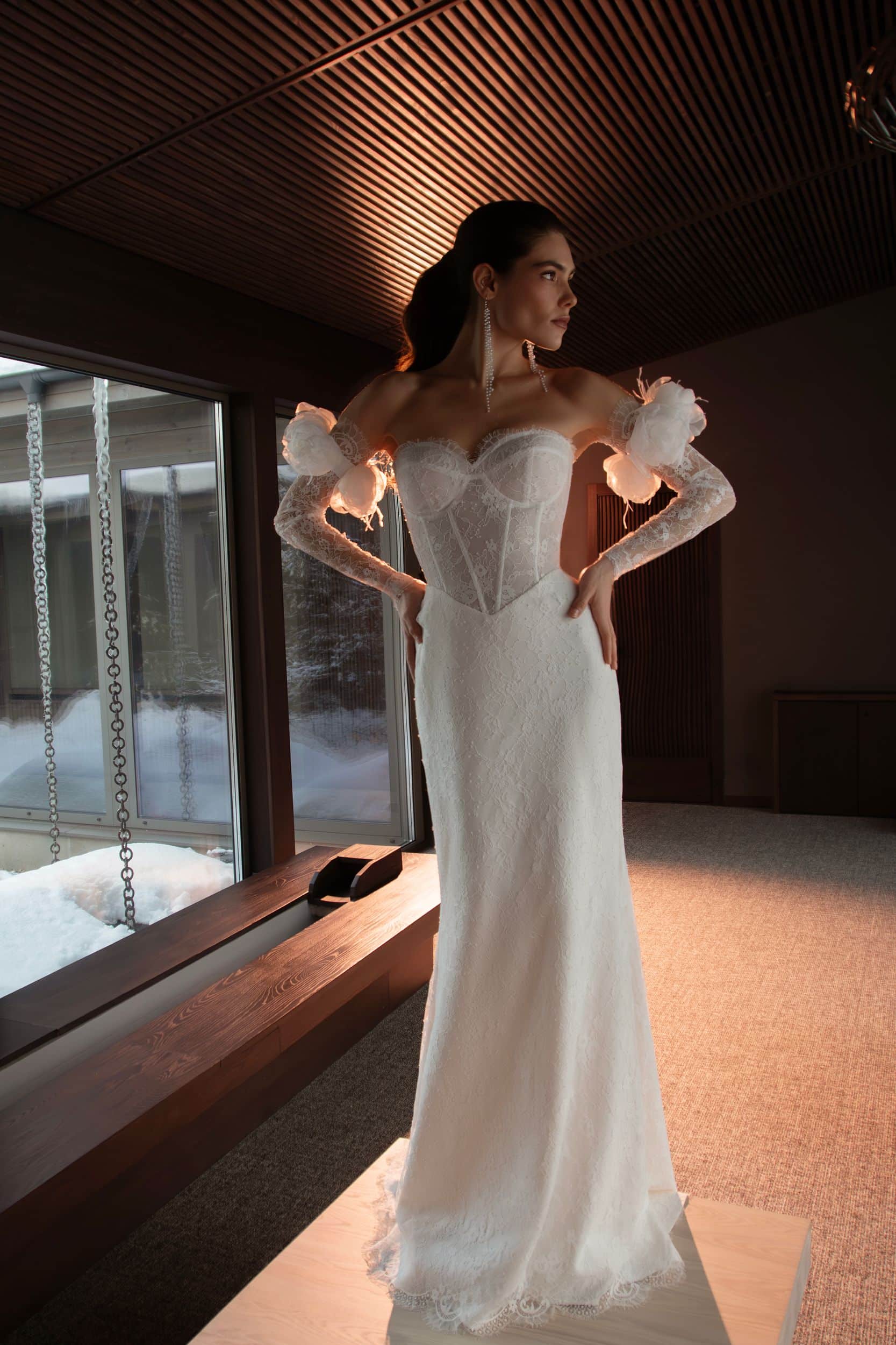 Das Brautkleid Modell Djenet von LeRina ist die perfekte Wahl für Bräute, die moderne Eleganz mit romantischer Raffinesse verbinden möchten. Diese Kleid besticht durch seine zarte Spitzenverarbeitung, die sich wie eine zweite Haut über den Oberkörper legt und eine sinnliche, feminine Silhouette zaubert. Sowohl der transparente Spitzen Bereich mit langen Ärmeln, als auch die schulterfreien Spitzenärmel sorgen für eine edle Leichtigkeit und verleihen dem Look eine zeitlose Anmut.