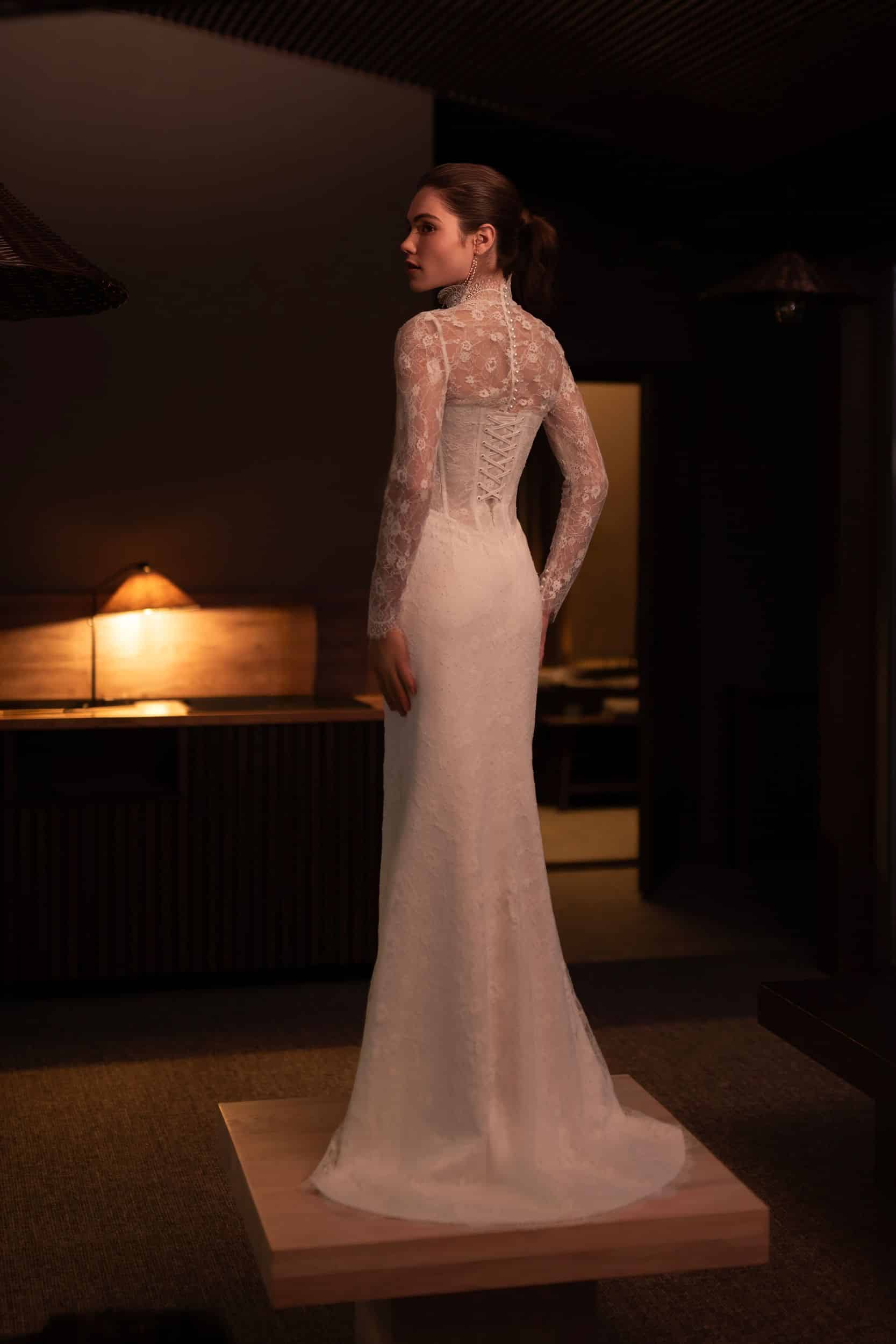 Das strukturierte Corsagenoberteil formt eine wunderschöne Taille und bietet gleichzeitig optimalen Halt. Der fließende, minimalistische Rock setzt einen ruhigen Kontrast zur detailreichen Spitze und lässt das Kleid insgesamt sehr hochwertig und stilvoll wirken. Besonders im Licht entfaltet das Modell Djenet seine volle Wirkung und sorgt für einen unvergesslichen Auftritt.