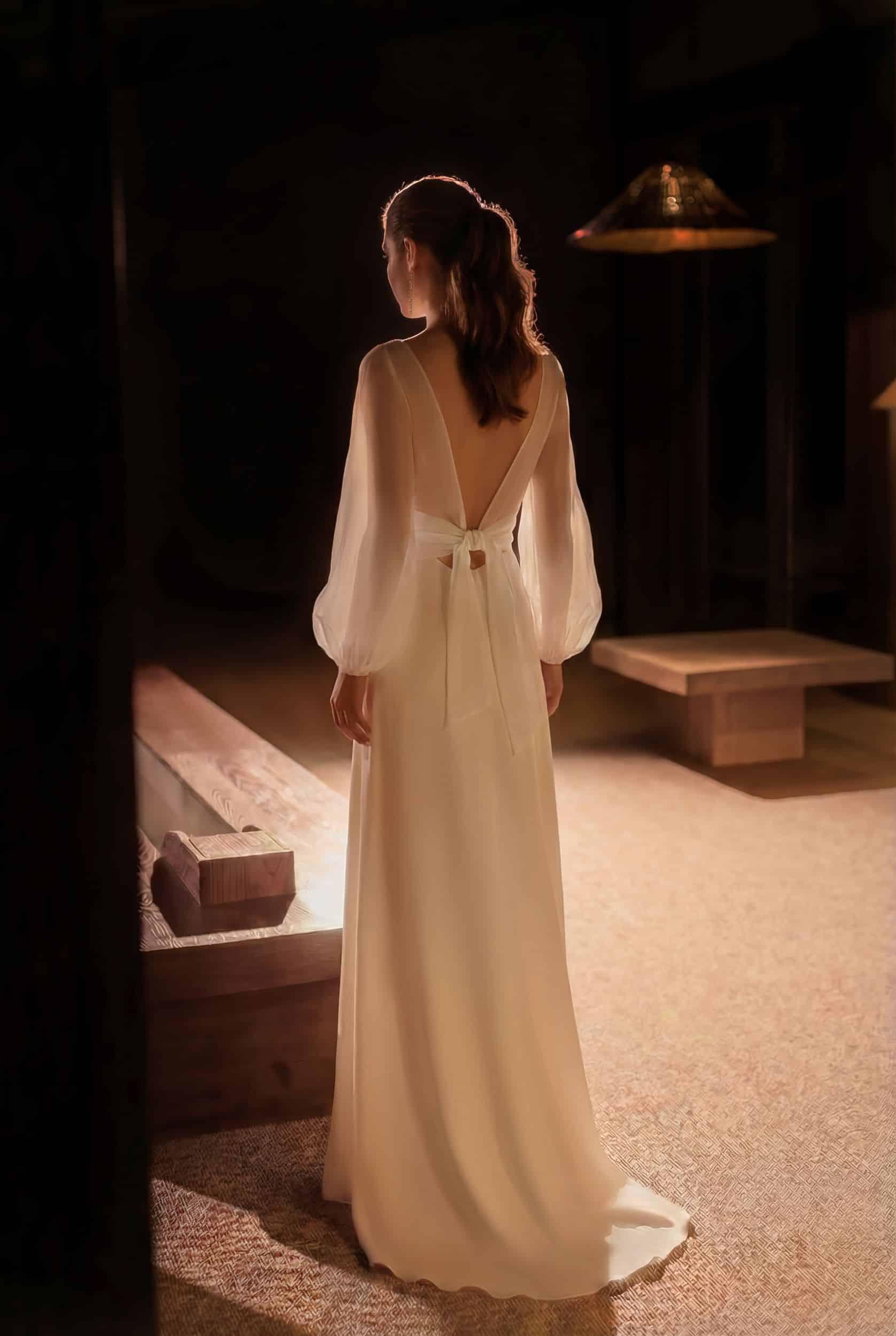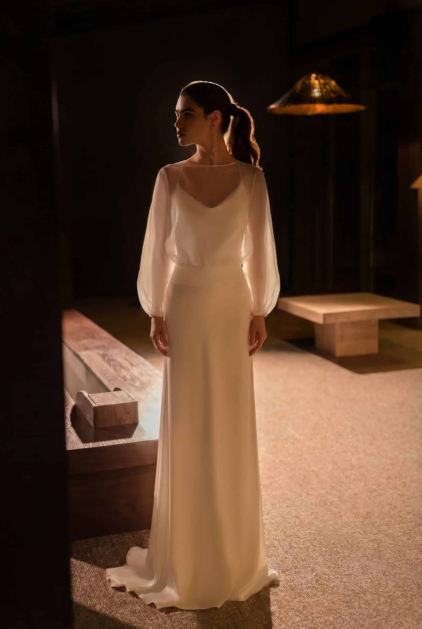 Das Brautkleid Modell Milia von LeRina verkörpert moderne Eleganz mit einem Hauch zeitloser Leichtigkeit. Dieses fließende Kleid begeistert mit seiner schlichten, femininen Silhouette und hochwertigen Materialien, die sanft die Figur umspielen. Der zarte, leicht transparente Oberstoff verleiht dem Design eine luftige Note, während die langen, weiten Ärmel für einen romantischen und zugleich stilvollen Auftritt sorgen.