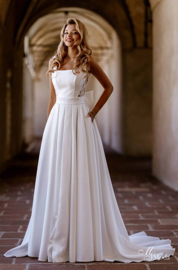 Ein cleanes, modernes Brautkleid mit elegantem Square Neck – schlicht und doch voller Raffinesse. Hinten ziert eine romantische Schleife den Rücken, während seitliche Cut-outs an der Corsage mit feiner Spitze besetzt sind und einen Hauch von Sinnlichkeit verleihen. Dieses Kleid verbindet klare Linien mit zarten Details und ist perfekt für Bräute, die einen minimalistischen Look mit besonderem Charme lieben.