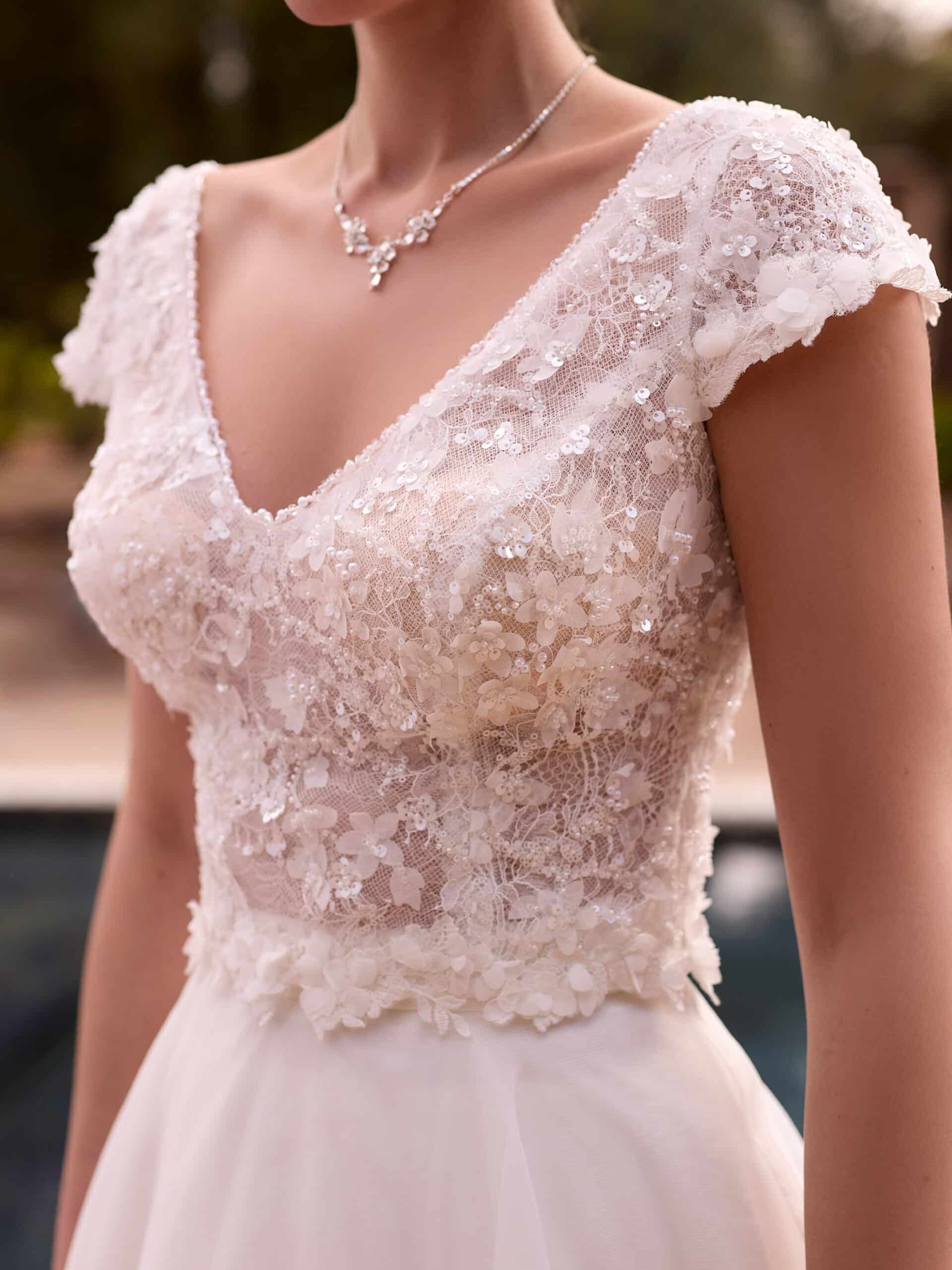 Das Brauttop E509 von Bianco Evento vereint romantische Spitze mit moderner Eleganz. Der feminine V-Ausschnitt und die zarten Ärmel schmeicheln der Silhouette und sorgen für einen stilvollen, leichten Look. Die feine, transparente Spitze verleiht dem Top eine luftige Ausstrahlung und macht es ideal für Sommerhochzeiten oder das Standesamt.