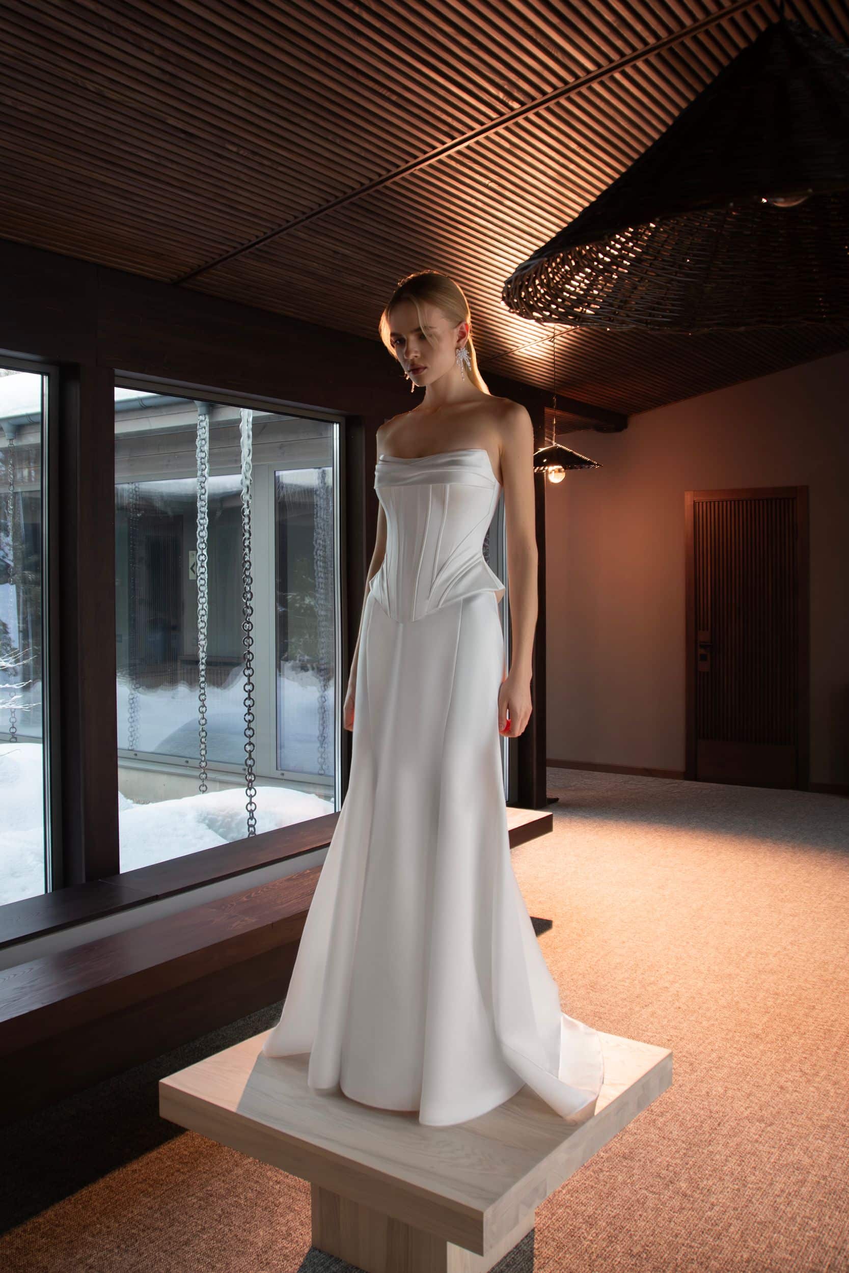 Der glatte Stoff unterstreicht die zeitlose Ästhetik und macht die Corsage vielseitig kombinierbar, ob mit fließendem Rock oder moderner Brauthose. Perfekt für Standesamt, freie Trauung oder einen individuellen Bridal Look. Die Corsage Modell Bleik von LeRina ist ideal für Bräute, die schlichte Eleganz und moderne Leichtigkeit verbinden möchten.